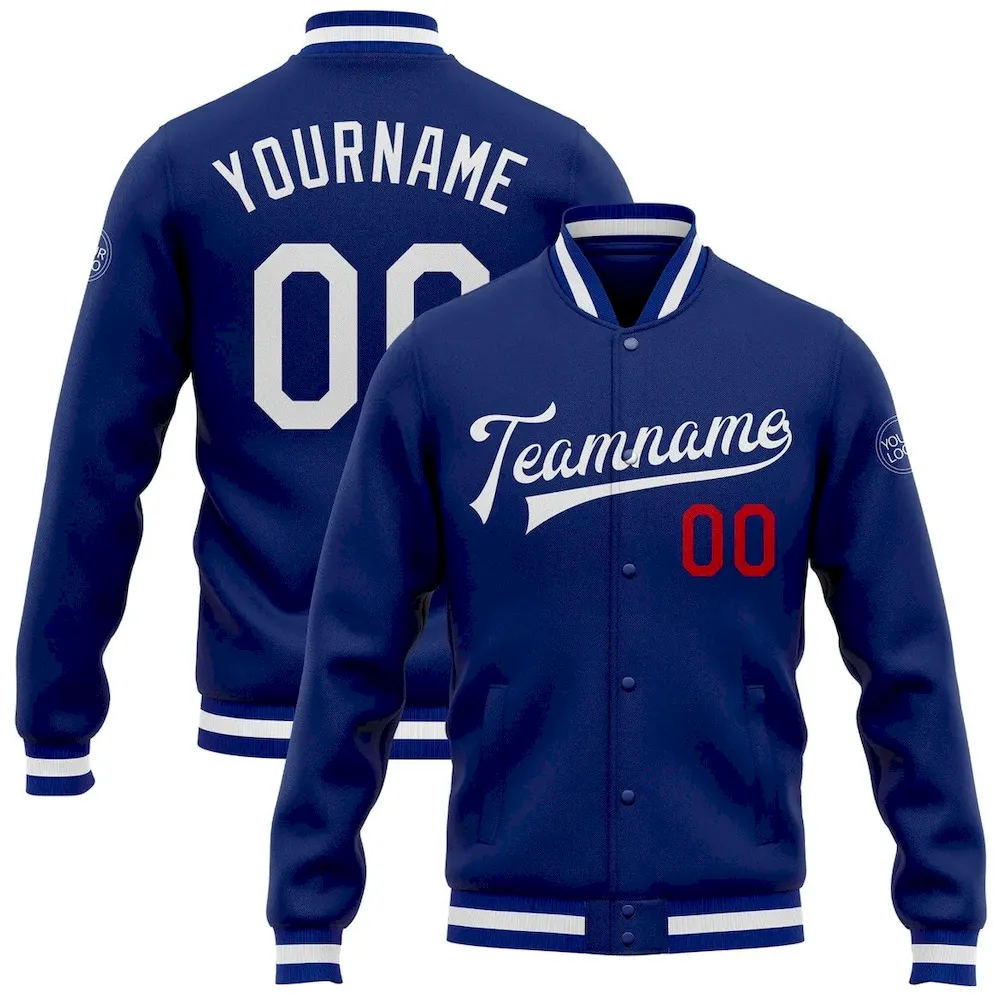 Custom Royal White-Red Bomber Full-Snap Varsity Letterman Jacket